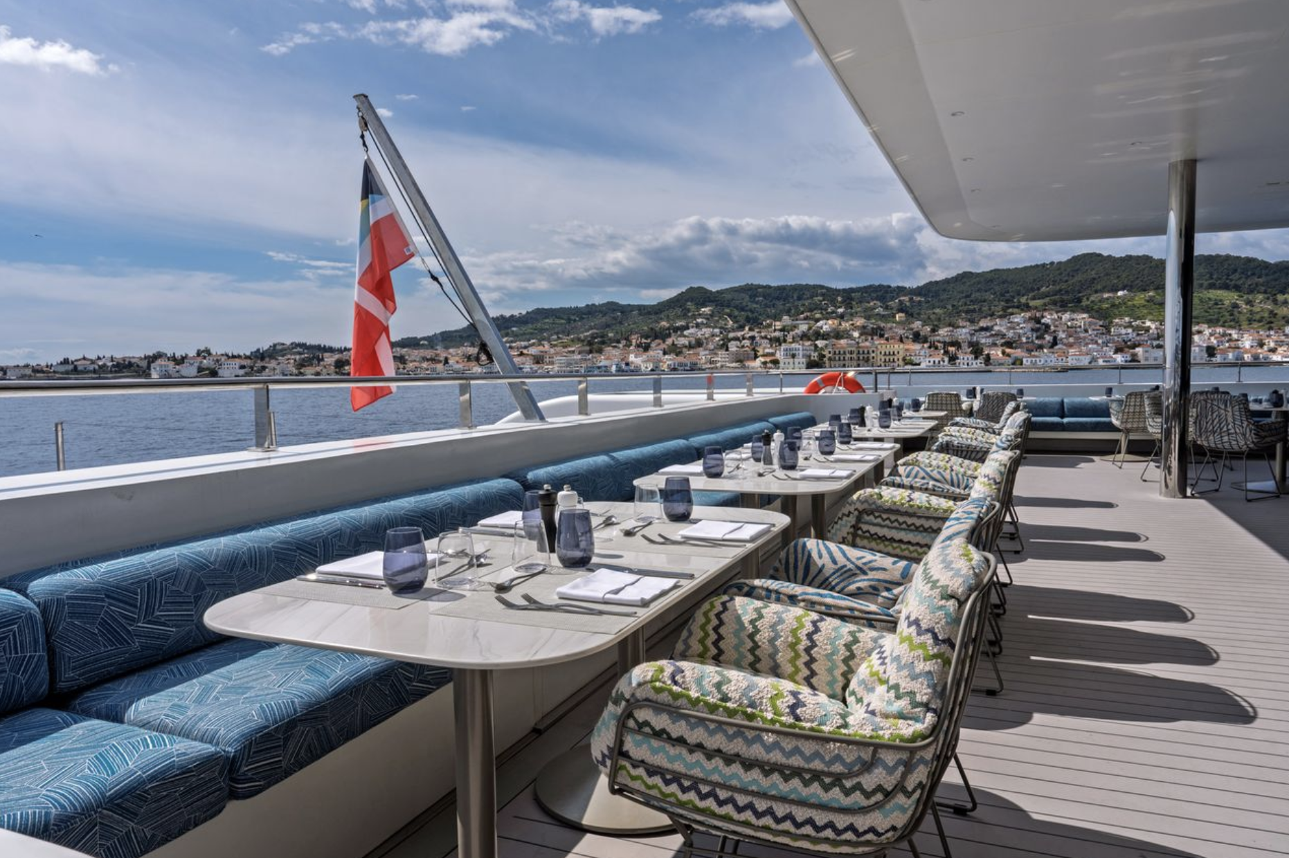 It’s easy yachting luxury rather than traditional cruising formality. Dining is designed to feel interactive and varied—an open kitchen concept that brings guests closer to the culinary process, relaxed Mediterranean-style poolside dining, and small-scale, highly curated private dining inspired by regional cuisines.